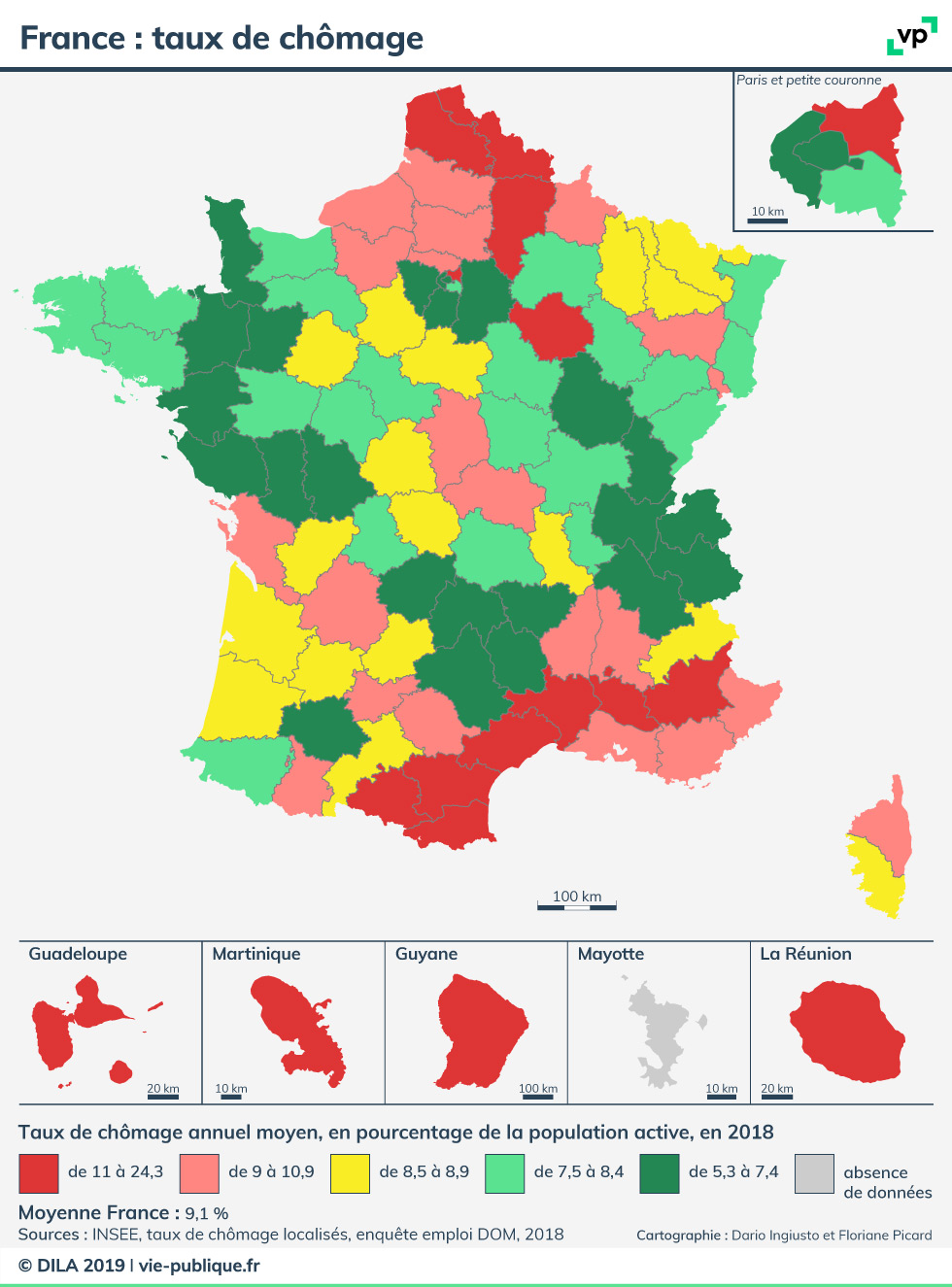 Le taux de chômage varie de 5,3 à 24,3% de la population active en France en 2018. La moyenne s’établit à 9,1%. Les départements d’outre-mer, du nord et du sud-est de la France sont les plus touchés.