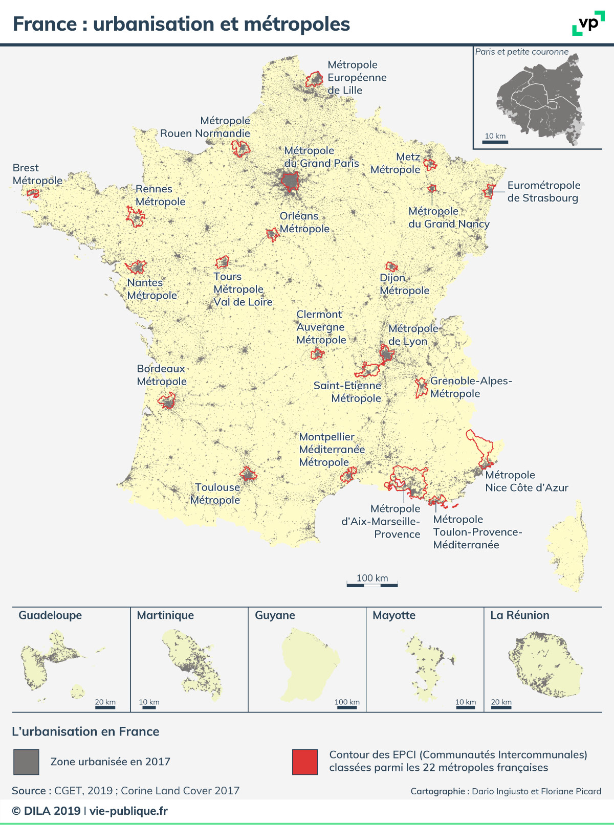 Zones urbanisées en France en 2017 et limites des 22 métropoles, établissements publics de coopération intercommunale (EPCI).