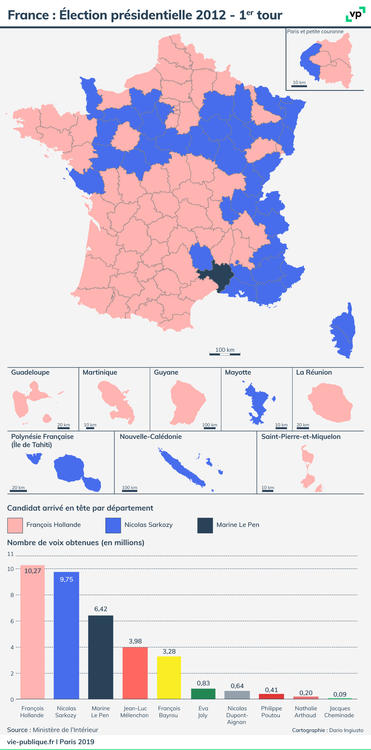 Lors du premier tour de l’élection présidentielle en 2012, François Hollande arrive en tête dans les départements français (10,27 millions de voix), suivi de Nicolas Sarkozy (9,75 millions de voix) puis de Marine Le Pen (6,42 millions de voix).