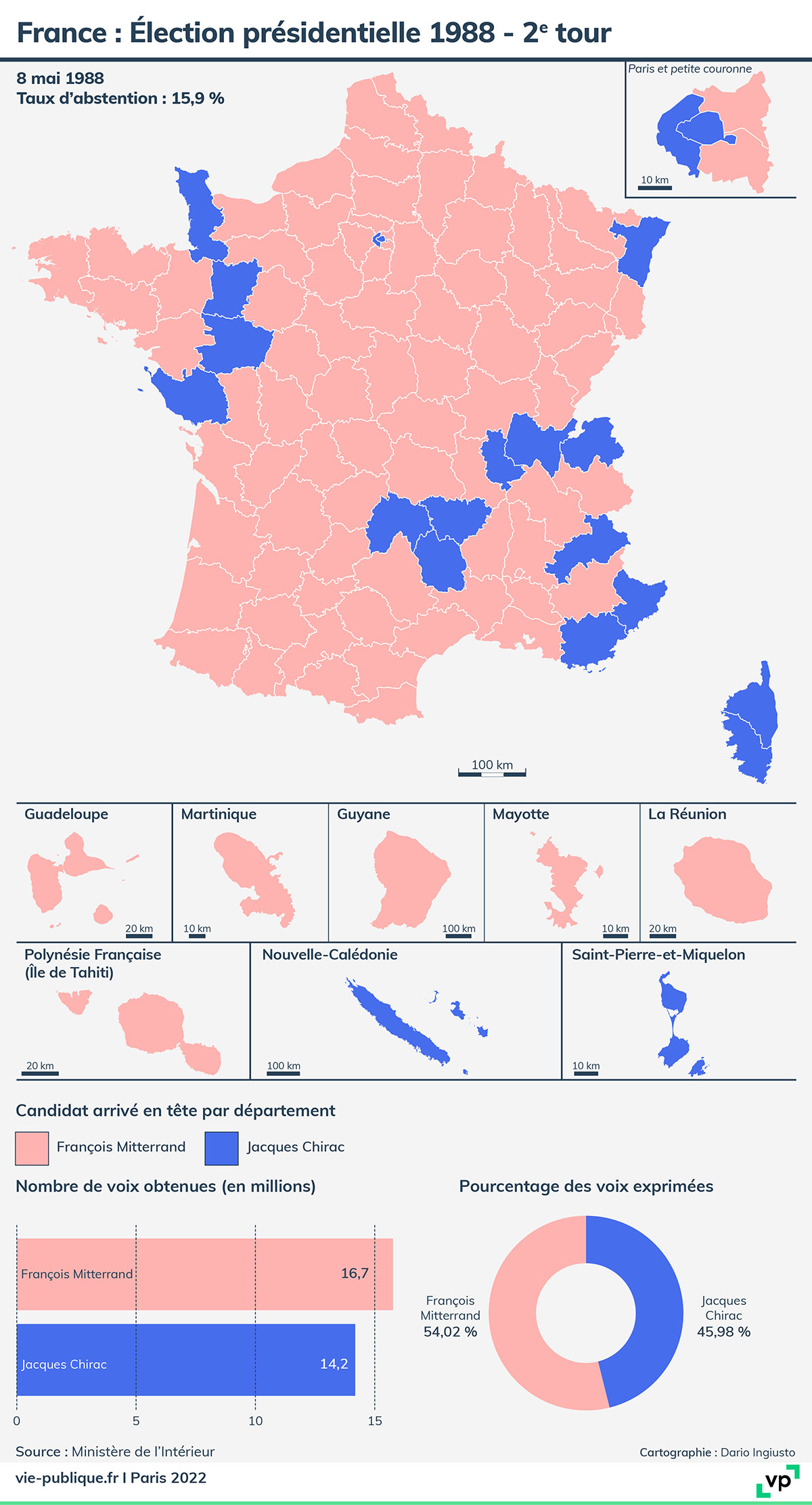 Au second tour de l'élection présidentielle 1988, François Mitterrand est élu face à Jacques Chirac avec 54,02% des voix.