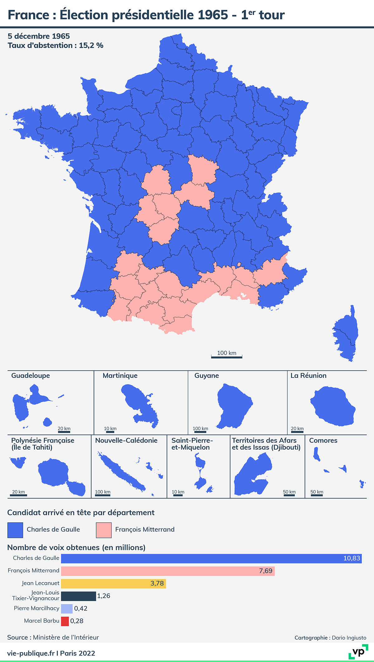 Lors du premier tour de l’élection présidentielle en 1965, Charles de Gaulle arrive en tête dans les départements français (10,83 millions de voix), suivi de François Mitterrand (7,69 millions de voix).