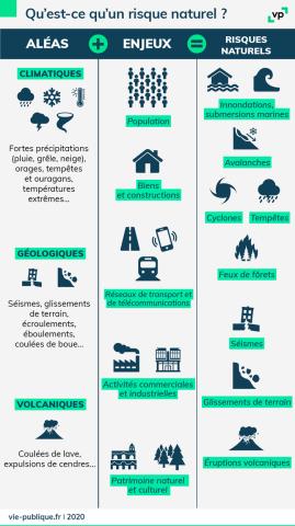 Le risque naturel est la confrontation d’un aléa avec des enjeux humains, économiques et environnementaux. Ainsi, la survenance d’un aléa comme un feu de forêt n'est un risque naturel que s'il représente une menace pour les biens et les populations.