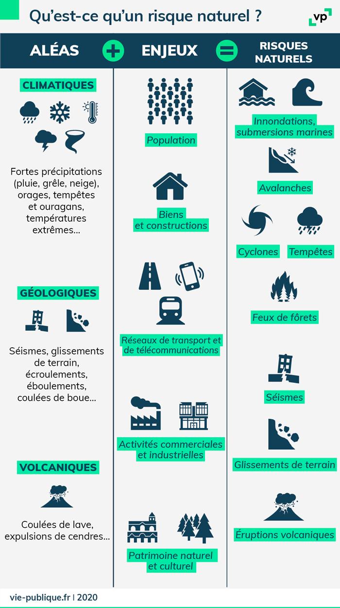 Les risques naturels : inondations, submersions marines, avalanches, cyclones, tempêtes, feux de forêts, séismes, glissements de terrain, éruptions volcaniques.