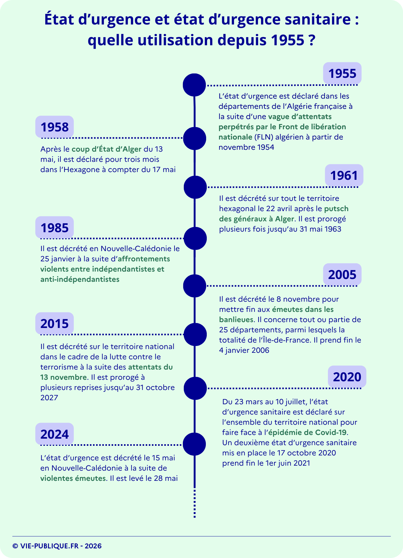 - 2020 : Du 23 mars au 10 juillet, l'état d'urgence sanitaire est déclaré sur l'ensemble du territoire national pour faire face à l'épidémie de Covid-19. Un deuxième état d'urgence sanitaire mis en place le 17 octobre 2020 prend fin le 1er juin 2021.