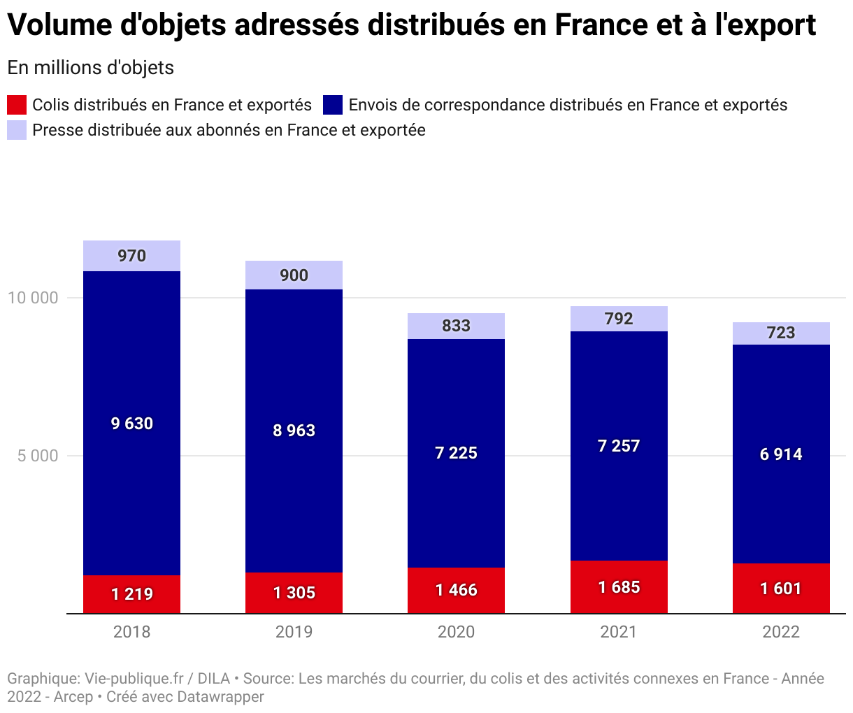 Le rapport annuel de l’Arcep du 19 octobre 2023 sur l’activité de distribution des plis, colis et portage de presse par circuit postal permet d’observer les évolutions par types de produits acheminés (plis, colis de faible ou gros volume, portage de presse, publicité non adressée) et par flux (domestique ou international). Fait notable en 2022, le marché du colis, en croissance régulière depuis 2017, est en baisse, en volume comme en valeur.