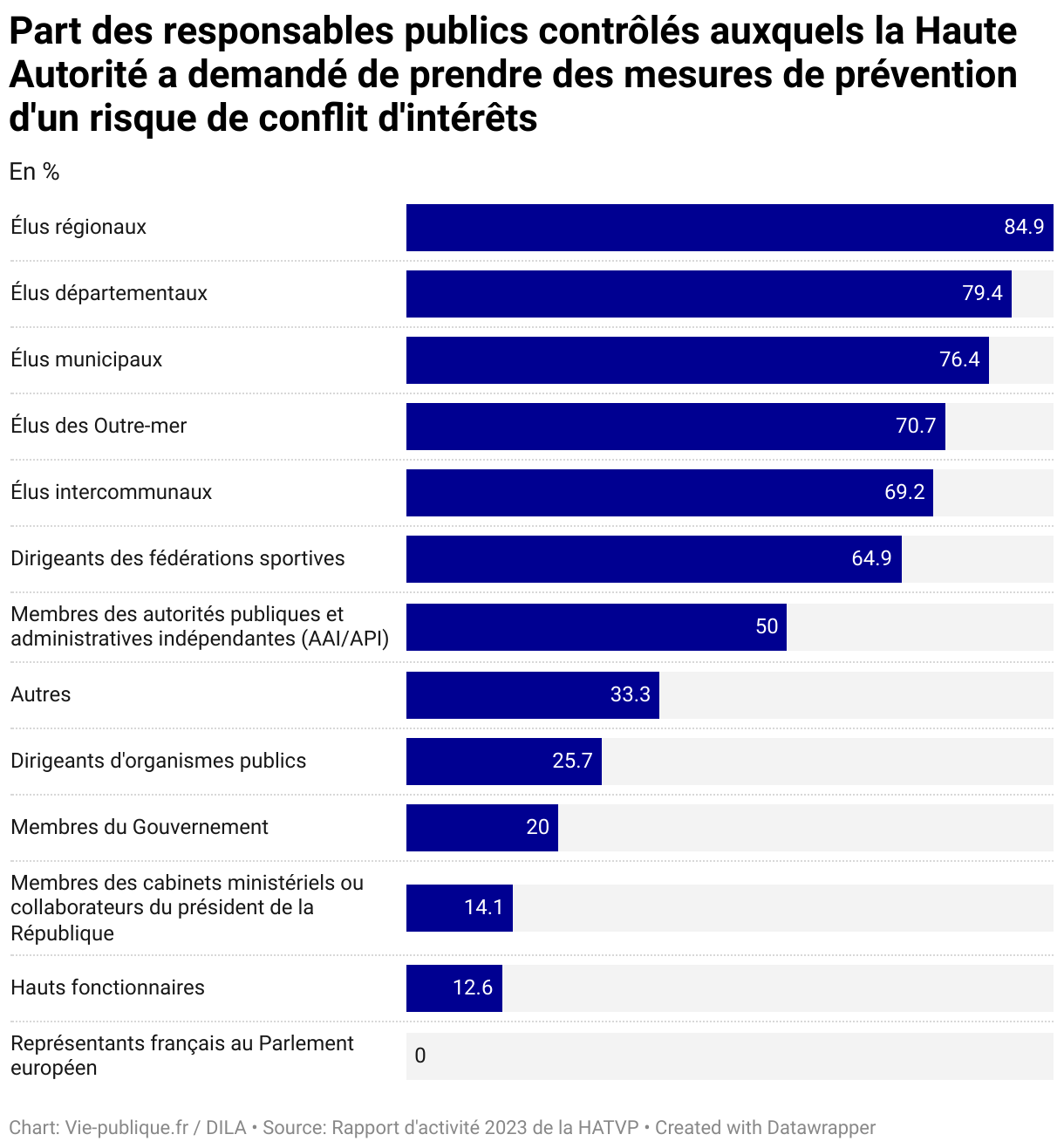 - la HATVP a rendu publiques 4 818 déclarations d’intérêts. 35,8% des responsables publics dont la déclaration d’intérêts a été contrôlée se sont vu prescrire des mesures visant à prévenir un risque de conflit d’intérêts.