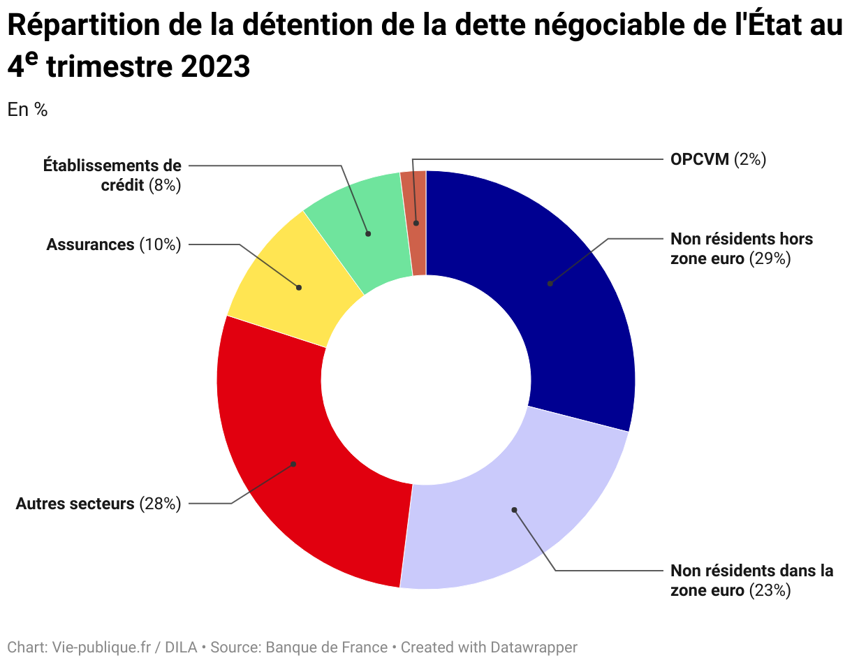 Le rapport de l’Assemblée nationale, déposé par Kévin Mauvieux le 29 mai 2024, rappelle que la santé financière d’un État repose sur plusieurs éléments, tels que le taux de refinancement, l’échéance et la nature des divers titres ou la part de la dette consacrée à des dépenses d’investissement. Mais l’origine du financement de la dette est également un élément important qui permet de comprendre la fiabilité des financeurs de l'État.