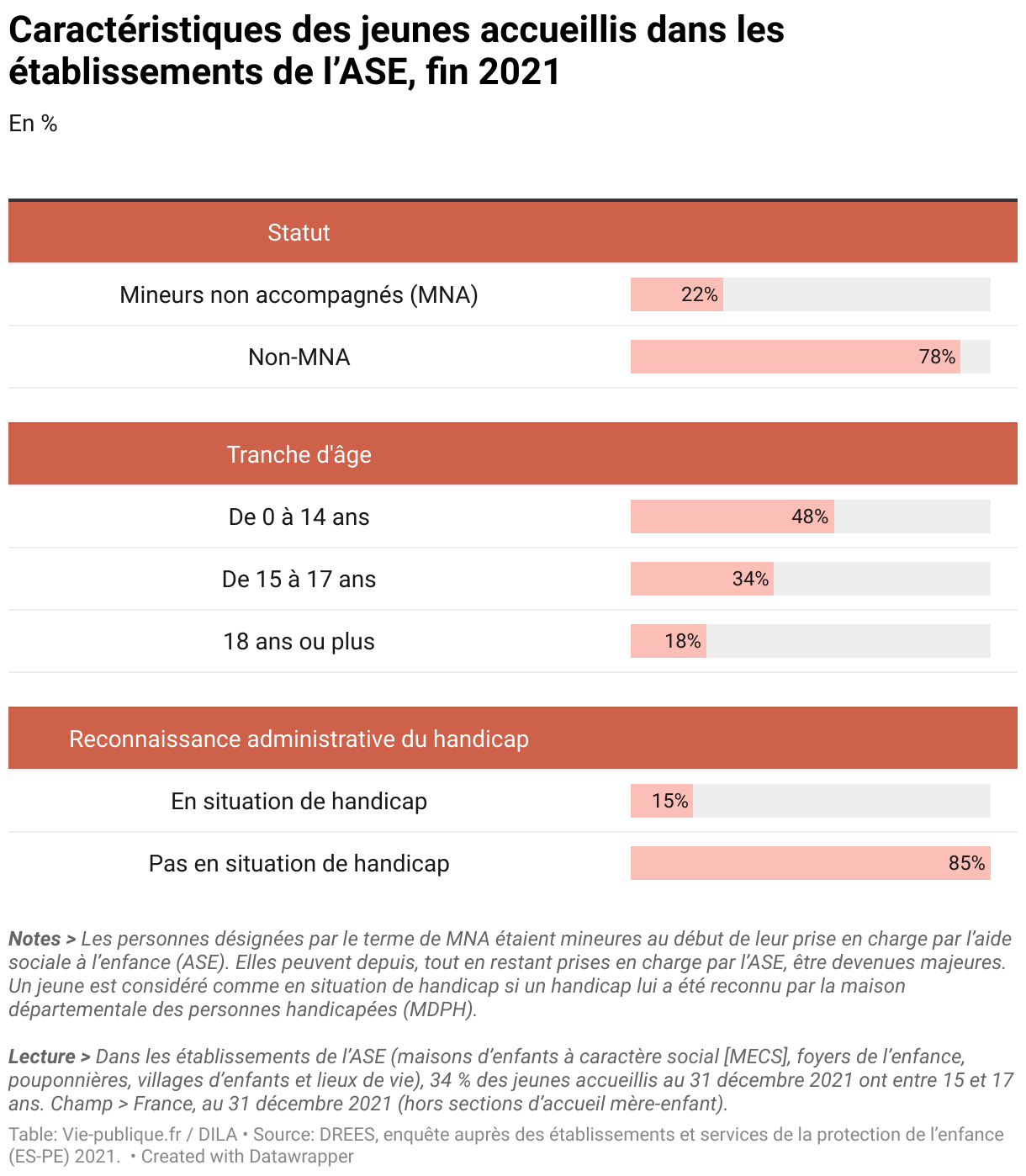 Par ordre d’importance et par catégorie d’âge, les placements concernent d’abord les enfants de 0 à 14 ans (48%), les mineurs de 15 à 17 ans (34%) et les jeunes majeurs (18%, en hausse en 2021).