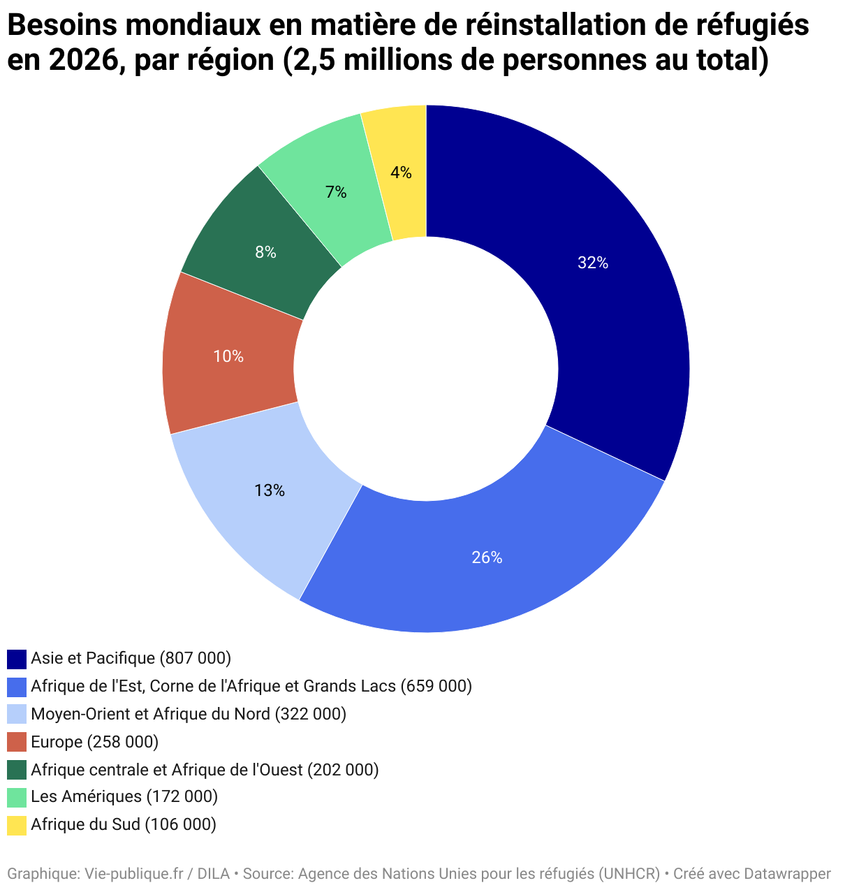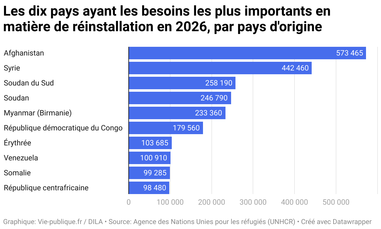 Le nombre de réfugiés ayant besoin d'être réinstallés est en baisse par rapport à l'année précédente, passant de 2,9 millions en 2025 à 2,5 millions en 2026. La chute de Bachar El-Assad en Syrie, deuxième pays au rang des réfugiés, a permis le retour d'une partie des déplacés qui avaient fui le régime.