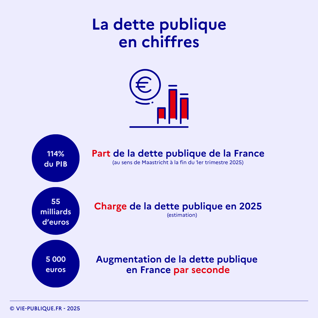 - 55 milliards d'euros : charge de la dette publique en 2025 (estimation) ;