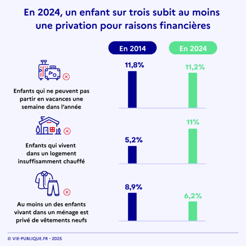 Dans une étude publiée le 13 novembre 2025, l'Institut national de la statistique et des études économiques (Insee) montre que 8,5% des enfants cumulent au moins trois privations et se trouvent en situation de "privation matérielle spécifique aux enfants". Cette proportion a légèrement diminué depuis 2014, mais elle reste particulièrement élevée dans les familles monoparentales et nombreuses.
