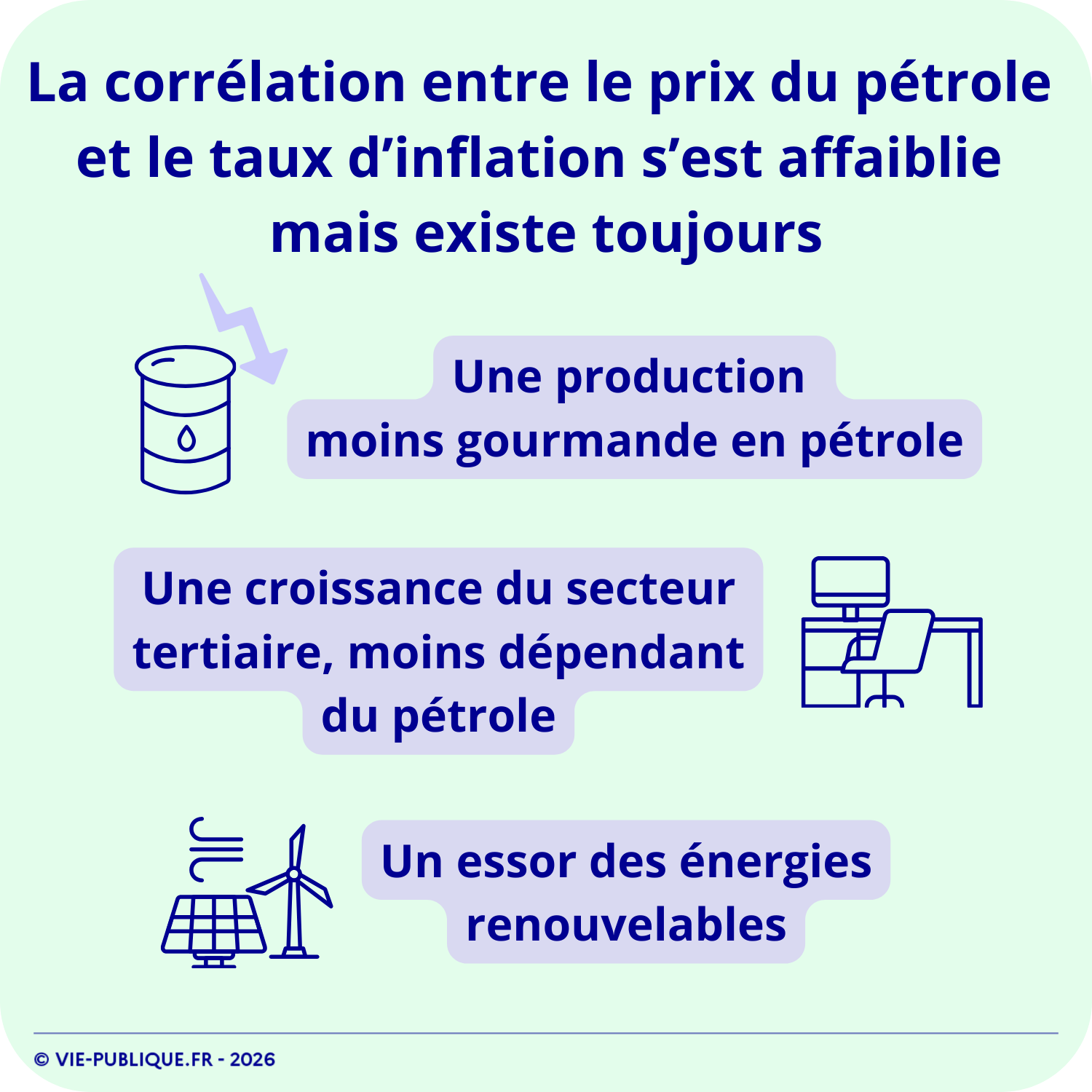 La corrélation entre les cours du pétrole et le taux d'inflation est depuis longtemps étroite. Encore en 2018, la Banque de France estimait qu'"une hausse de 10 euros du prix du pétrole augmente les prix à la consommation de 0,4% en zone euro et en France".