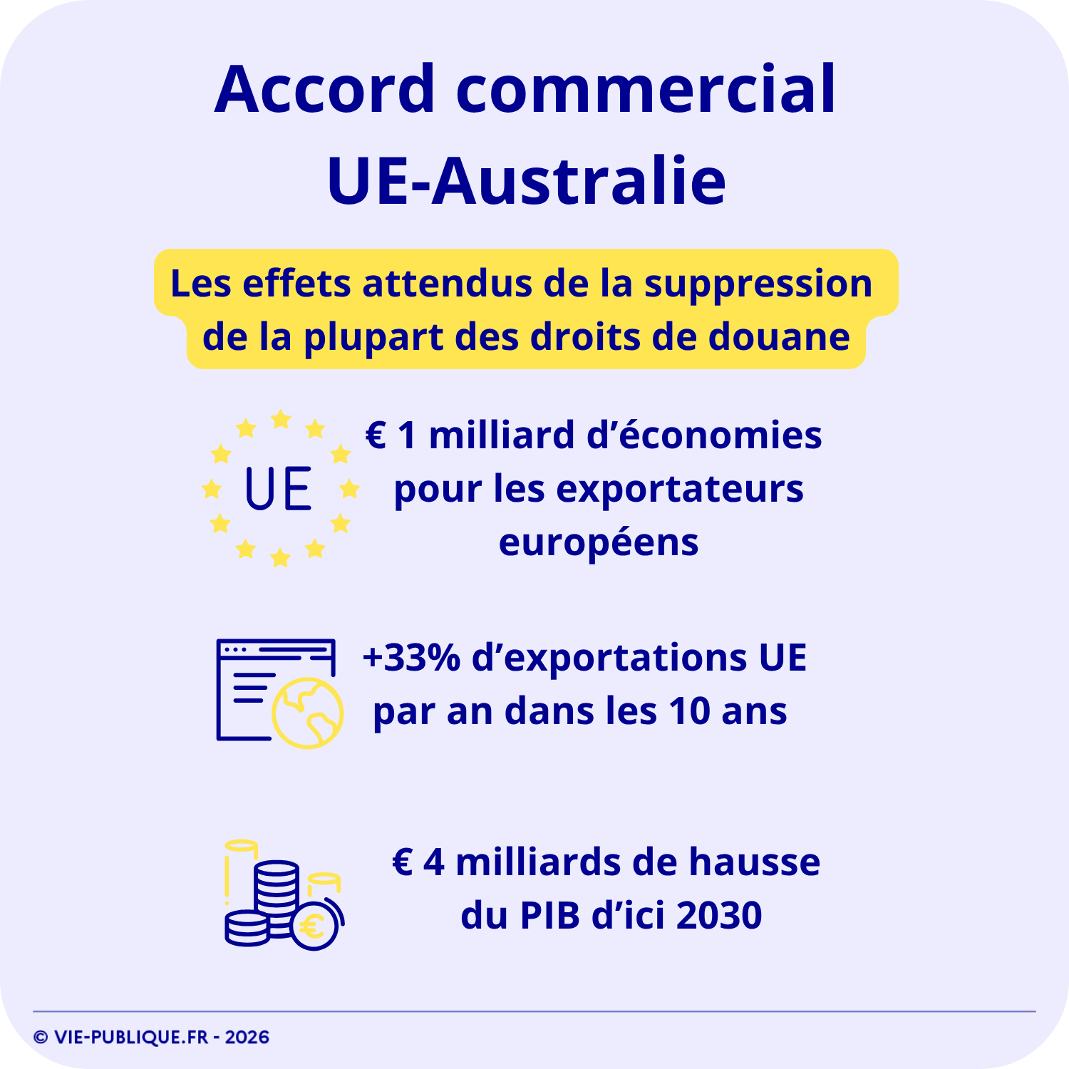 En 2024, l'Australie était le 20e partenaire commercial de l'UE pour les échanges de marchandises, tandis que l'UE occupait la troisième place parmi les partenaires commerciaux de l'Australie. Selon la Commission européenne, cet accord devrait avoir un impact positif sur l’économie européenne, notamment grâce aux nombreux domaines qu’il couvre en :