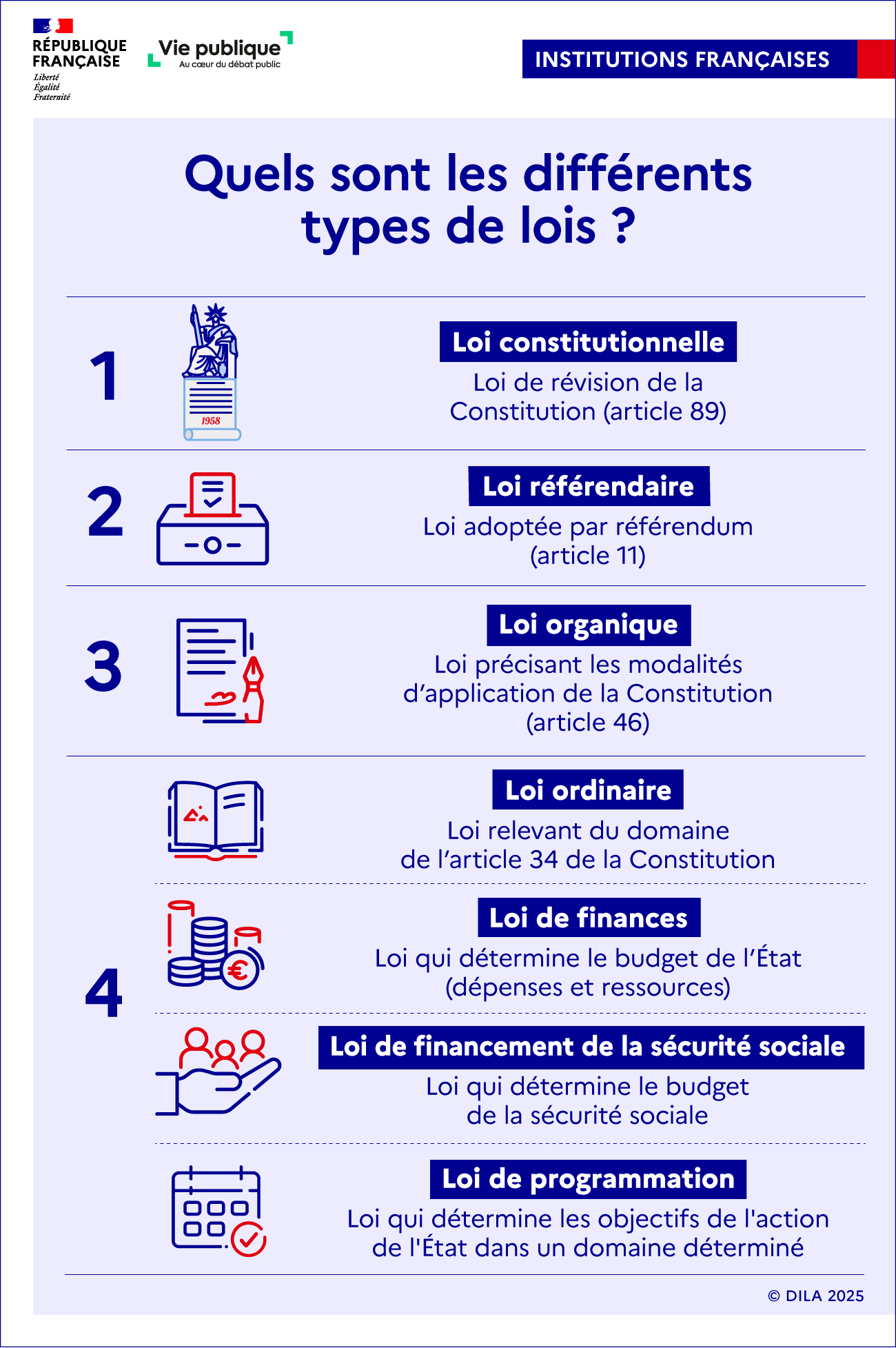 Les lois ordinaires sont des textes législatifs votés par le Parlement dans les domaines définis par l'article 34 de la Constitution. Parmi elles, on distingue :
