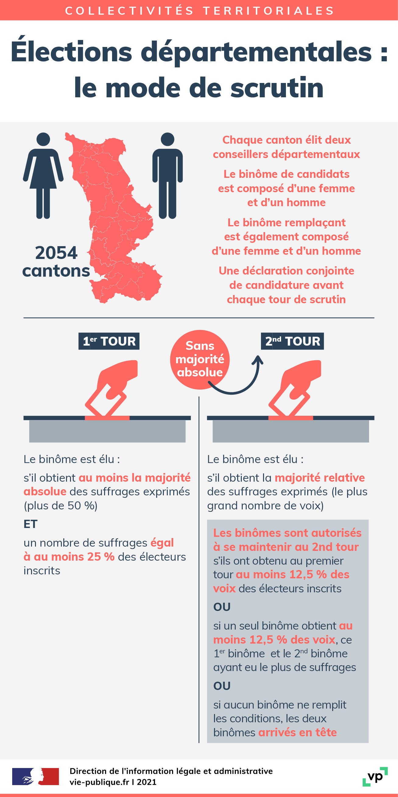 Organisées tous les six ans, les élections départementales renouvellent les conseils départementaux dans leur intégralité. Le mode de scrutin est binominal mixte majoritaire à deux tours.