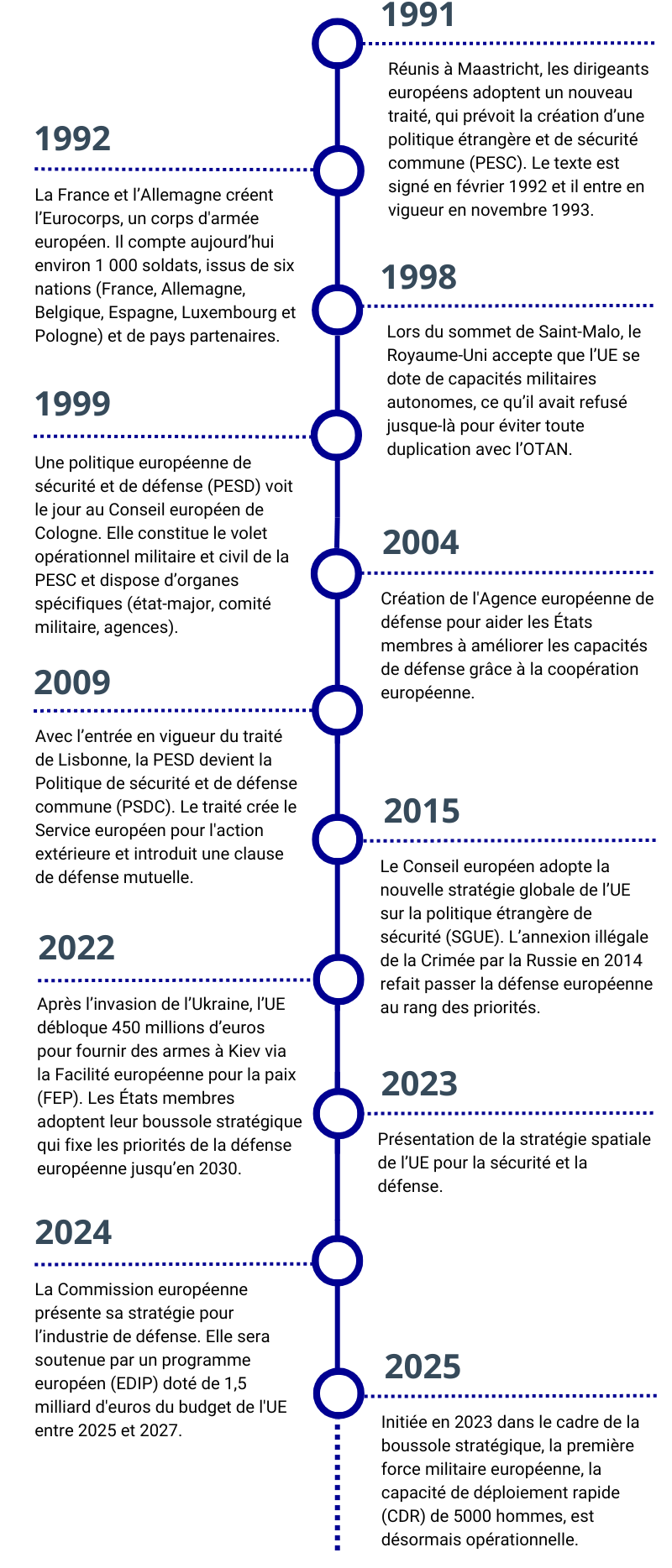 À l'heure actuelle, l'Union européenne ne dispose pas d'une armée propre. Ce sont les États membres qui mettent à disposition leurs moyens civils et militaires. Avec sa population de 449 millions d'habitants, l'UE possède pourtant le potentiel d'une puissance militaire de premier plan. Mais le manque d'interopérabilité des capacités militaires et humaines freine l'unification des forces armées des 27 États membres. Dans le cadre de sa boussole stratégique, l'UE a mis en place une force de réaction rapide de 5 000 soldats chargée de mener des missions variées (évacuation, stabilisation, opérations de sauvetage). Un premier exercice militaire a eu lieu en octobre 2023 en Espagne pour simuler une intervention dans un pays tiers. Près de 2 800 militaires issus de neuf États membres (Autriche, Espagne, France, Hongrie, Irlande, Italie, Malte, Portugal, Roumanie) y ont participé. |