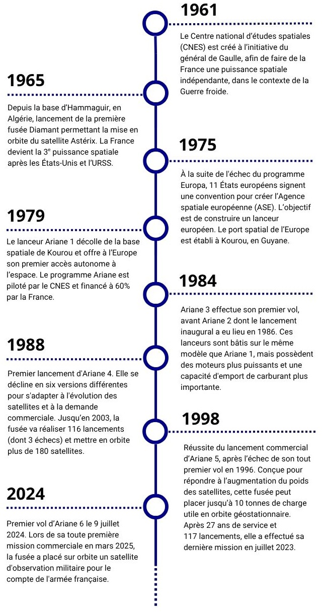 La France devient une puissance spatiale en novembre 1965 ; l'Europe, en décembre 1979. La création de l'Agence spatiale européenne (ESA), en mai 1975, par onze États, dont la France, permet à l'Europe spatiale de s'affirmer. Dès 1979 et sur plusieurs décennies, le programme Ariane sera un succès commercial et technologique. Les lancements se font depuis le Centre spatial guyanais (CSG), à Kourou. La France représente près de la moitié du secteur spatial européen et 35% de ses emplois, selon un rapport parlementaire. Mais l'organisation institutionnelle est morcelée. Pour y remédier, l’Union européenne a lancé un programme spatial doté de 14,8 milliards d’euros sur la période 2021-2027. Cependant, le budget spatial européen est insuffisant (8,1 Md€ en 2021) comparé à celui des États-Unis (40 Md$, soit 35 Md€). Les États-Unis disposent de capitaux privés très importants et s'appuient sur des opérateurs privés, le New Space. Les développements récents du New Space représentent pour la France et l'Europe un risque de décrochage. La tutelle du secteur spatial en France est passée en 2020 du ministère de la recherche au ministère de l'économie, afin de combler le retard français et favoriser l’innovation industrielle. |
