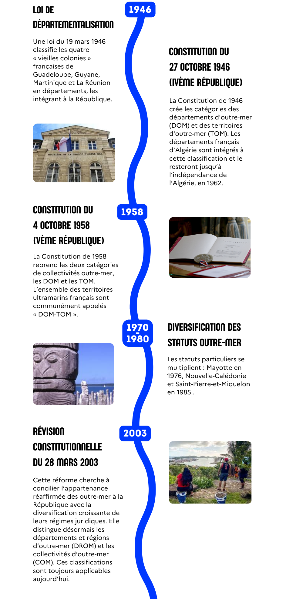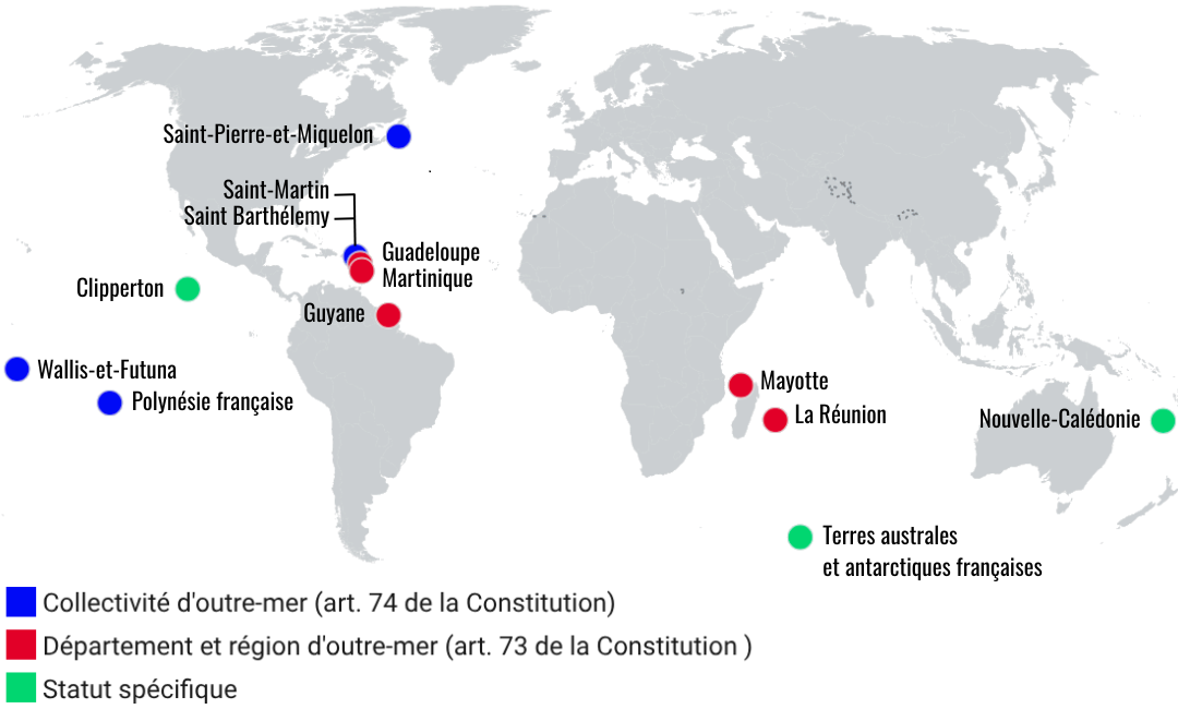 « Le traitement juridique des outre-mer dans l’histoire coloniale puis contemporaine a façonné les bases d’une « citoyenneté minorée », vecteur d’inégalités dans l’accès à certains droits fondamentaux. Il n’est pas surprenant que, avant 1946, le principe de spécialité juridique qui régissait les colonies françaises, selon lequel les lois adoptées en métropole n’étaient pas appliquées dans les colonies ou seulement à la demande expresse du législateur ou de l’exécutif, ait produit de profondes inégalités à la défaveur des populations dominées, tant en matière commerciale que sur le plan civil (accès à la citoyenneté, droits de propriété, droit du travail, droit d’accès à l’éducation, etc.). En revanche, le statut de citoyen de « seconde zone » réservé aux ultramarins après 1946 est plus difficile à comprendre, surtout pour les territoires (la Guadeloupe, la Guyane, la Martinique, La Réunion, et Mayotte en 2011) qui ont opté pour l’assimilation législative à travers le statut politique de la départementalisation. En effet, même si, en théorie, le droit commun s’y applique parce que ce sont des circonscriptions françaises, les départements et régions d’outre-mer (DROM) ont conservé une particularité juridique qui renvoie à leur passé colonial et qui explique l’éventuelle application d’une législation spécifique, comme le prévoit l’article 73 de la Constitution. » |