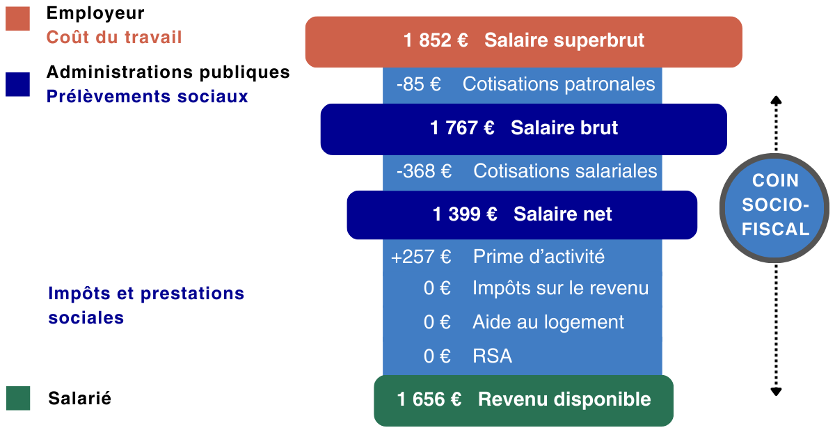 Au 1er juillet 2024, pour augmenter le revenu disponible d'une personne seule au SMIC à temps plein de 100 euros, le coût du travail doit augmenter de 442 euros, d'après une étude de la Drees. Ce coût inclut le salaire net que perçoit le salarié, mais aussi les cotisations sociales salariales et patronales qui financent la protection sociale (chômage, retraite...). Pour soutenir l'emploi, l'État a allégé les cotisations patronales sur les bas salaires. Seulement, dès qu'un salaire dépasse un certain seuil (jusqu'à 1,6 SMIC), ces allègements diminuent. Les cotisations employeurs augmentent donc plus fortement que le gain pour le salarié. Cela peut avoir un double effet négatif :